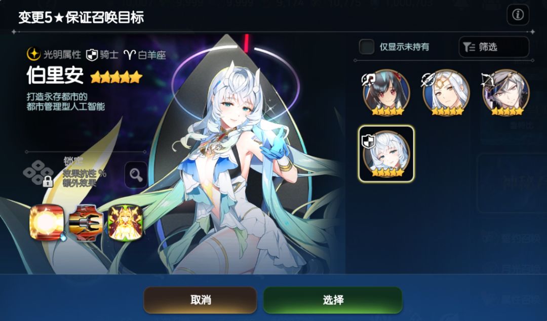 5星月光角色:「光之瑞儿」「审判者绮世」「司令官帕贝尔」「伯里安」四选一