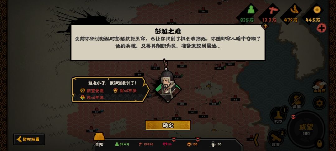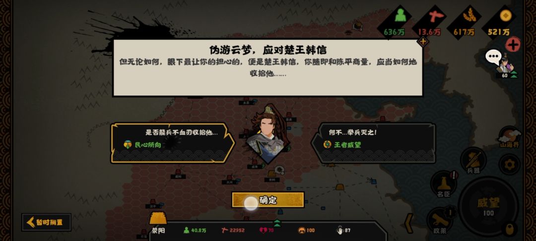 刘邦开局彭城打败之后诸侯会叛离,张良选第一个是不招,第二个选项是招。