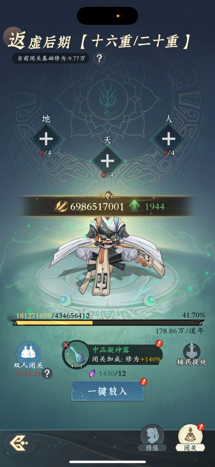 修为来到后期16重41%,闭关石1430,境界排名45,战力69.86亿,玉元2.01万
