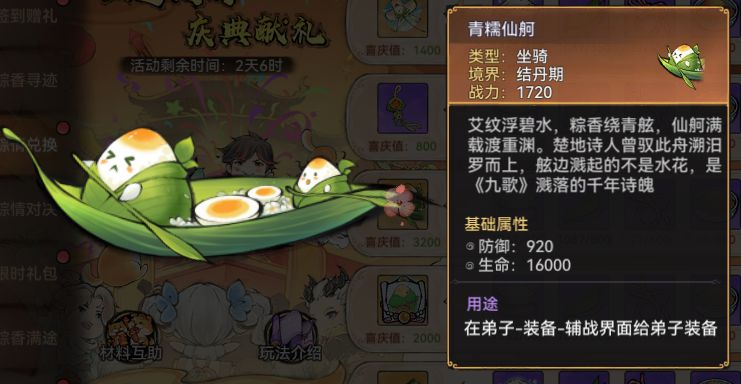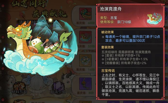活动期间,祖师消耗灵米等活动材料即可免费兑换云舟装扮-龙腾端阳、古宝-沧溟竞渡舟、坐骑-青糯仙舸等珍稀奖励。