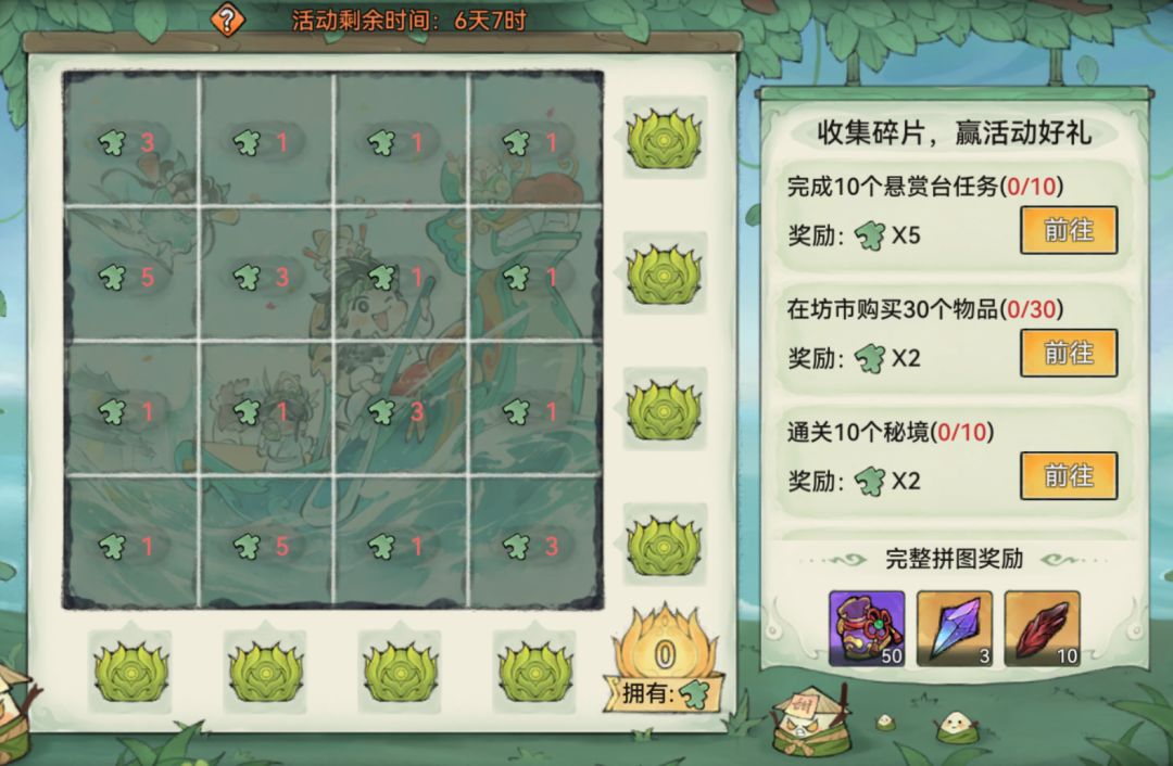 活动期间,祖师完成任务可获得粽香碎片,使用粽香碎片可解锁拼图。