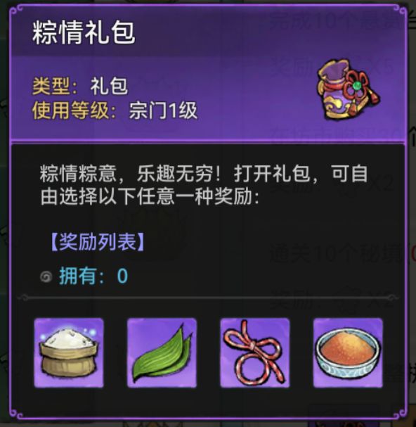 除了通过开启粽情礼包获取兑换材料外,在活动期间,祖师击败怪物或是完成灵田&林场生产时也有概率获得相应的兑换材料。