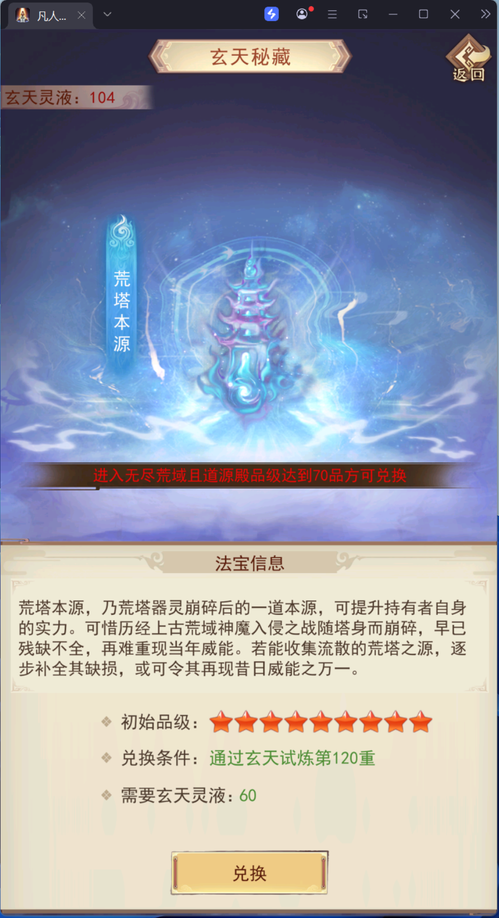 - 兑换要求:仙尊1阶【消耗60灵液】且道源殿70品