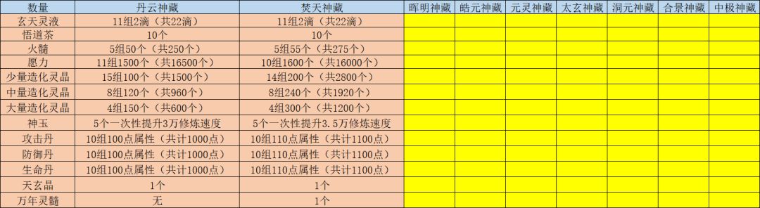 - 说明:先确保【荒塔本源】的兑换,后续消耗灵液升级秘藏,优先升级【紫晶瓶】和【天元炉】,关于先升【净魂玉】还是先领悟【无字天书】,取决与想要属性还是出窍收益。如果你迷茫不知道升哪个,那么就说明你对属性战力要求不是很敏感,就升【净魂玉】。