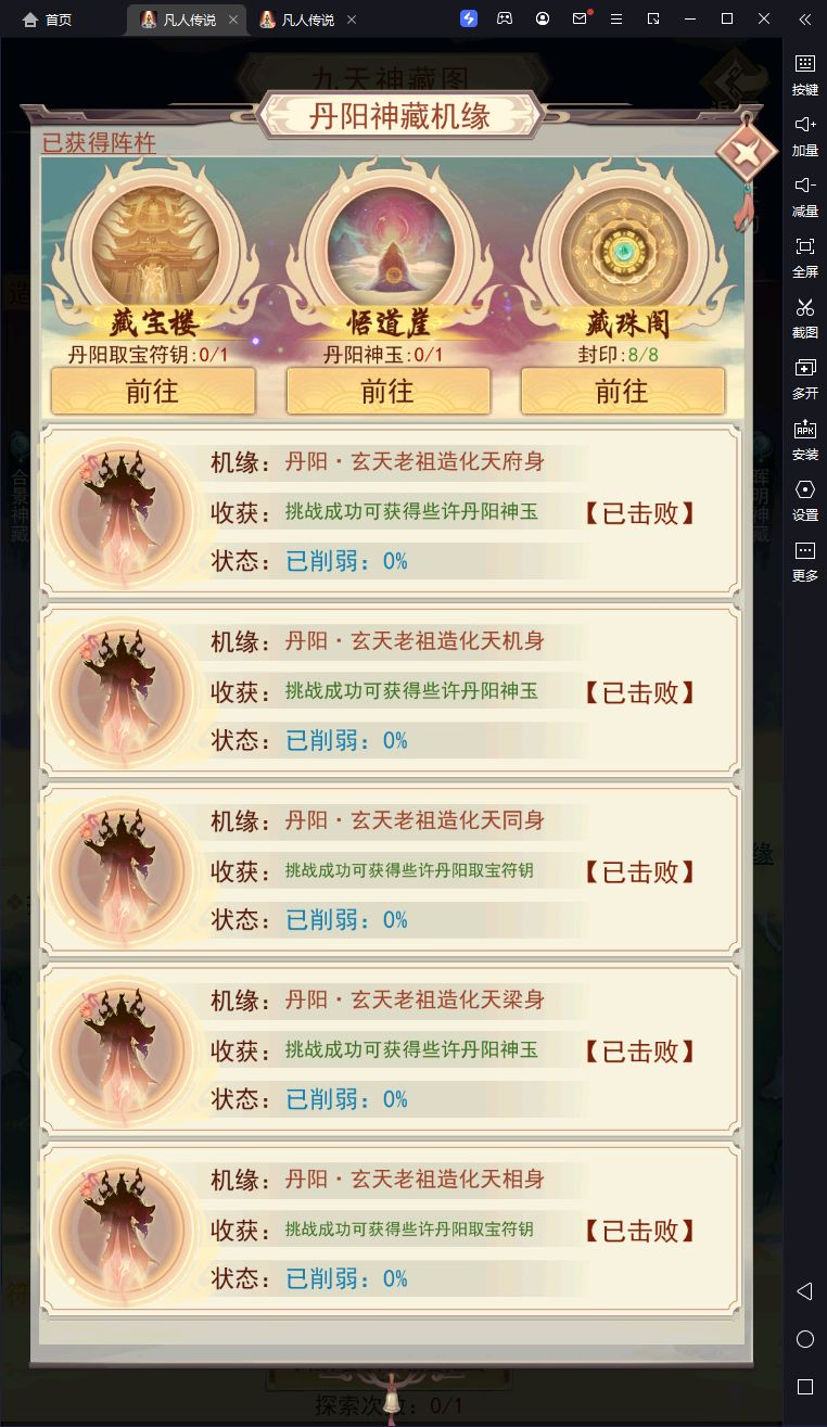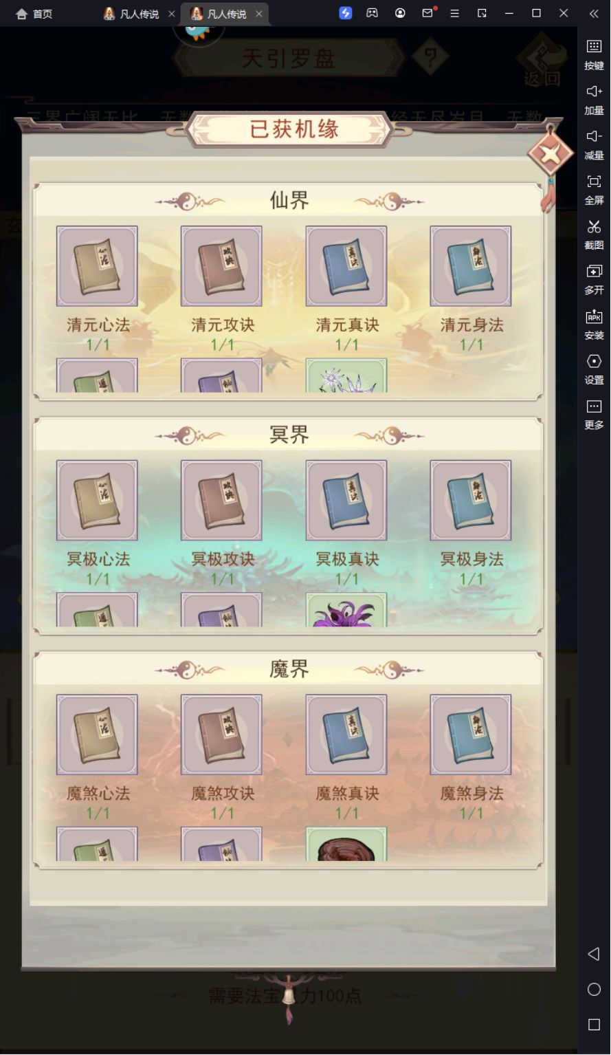 - 秘藏效果:可进行“三界寻宝”,随机获得功法、三维丹、天品法宝、草药、矿材等资源。