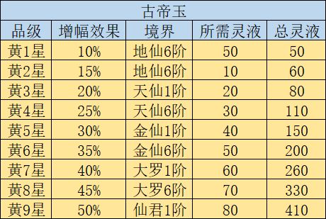 - 说明:我认识一个丹帝,TAP-99的不器君,6403年天仙,9505年大罗金仙,期间历经32天,玄天灵阵能产生有90滴灵液(每日2.8滴灵液),玄天试炼有16滴,境界奖励有20滴,一共126滴灵液,减去40滴灵液兑换神藏图,剩余可资源分配86滴灵液,因此丹帝可以在金仙期兑换【古帝玉】,但不建议升级。普通玩家则建议不兑换【古帝玉】,可选择将【净心莲台】升至红1星(两次升级),在提缩减功法修炼时间的同时,不影响后续大罗期的兑换秘藏的节奏。