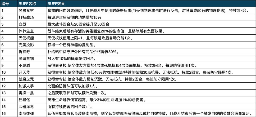6,开局守护buff三选1,每成功防守一波会获得对应的功勋,后续在可以在商店兑换守护buff,复活药剂、生命药剂等;