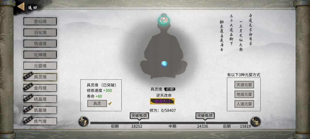 拿我的血灵入门举例,进阶之后发现没有血灵,先用造化丹刷新,刷新2次之后还是没有(前面刷血煞用了三个造化丹)小退重进,吃蘑菇进阶,造化丹刷新依旧没有,小退重进,祖师云房打坐拿到气运进阶,出血灵入门。