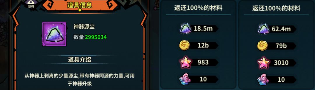 源尘卡:使用后可立即获得当前挂机奖励等级(小时数量)的神器源尘收益(取决于地下城进度,理论上来说地下城越高之后,使用价值才更高)