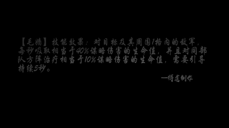 满级属性:对目标及其周围1格内的敌军,每秒吸取相当于40%谋略伤害的生命值,并且对同部队方阵治疗相当于10%谋略伤害的生命值,需要引导,持续5秒。