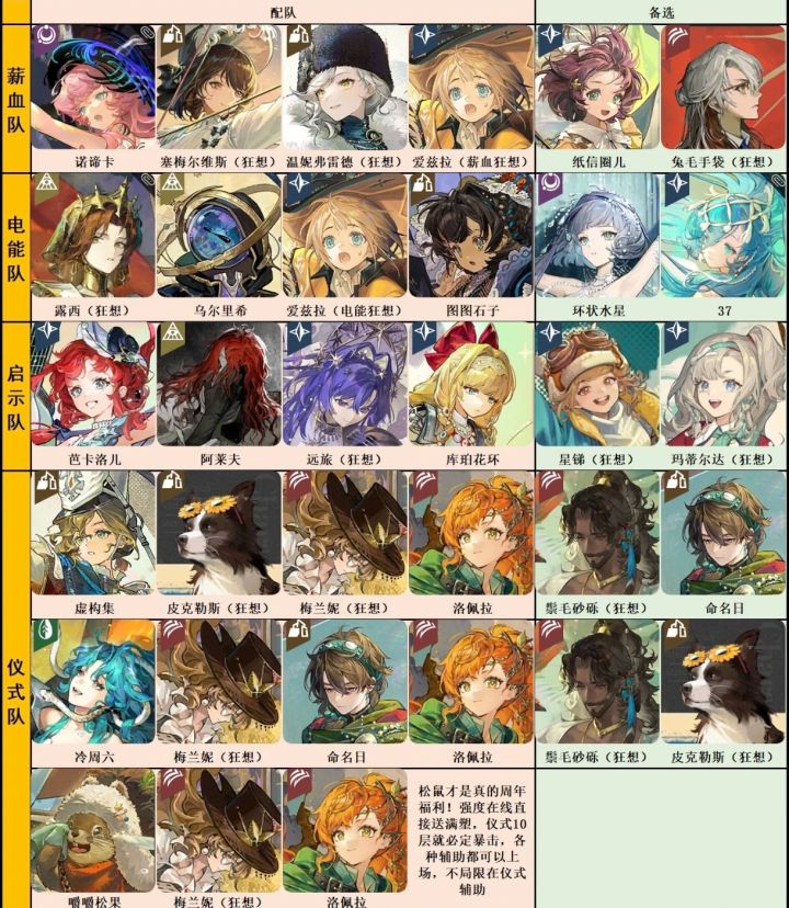 电能队凭借稳定的充能与高频攻击,在持久战中表现优异。队伍循环流畅,无论是清杂还是攻坚都游刃有余,是开荒与高难本的可靠之选。