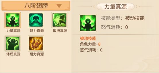 八阶翅膀会有五个被动技能,包括【力量真源】角色力量+8;【智力真源】角色智力+8;【敏捷真源】角色敏捷+8;【体质真源】角色体质+8;【耐力真源】角色耐力+8