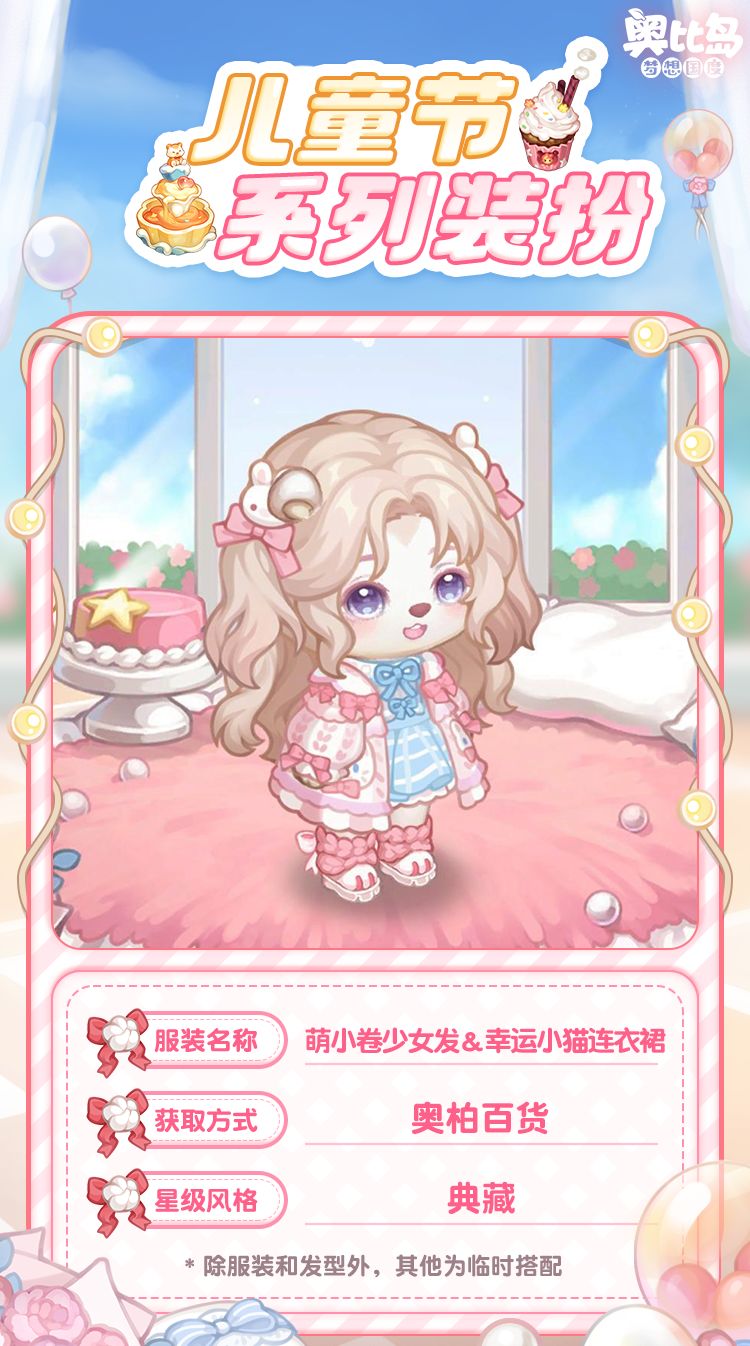 活动期间,奥柏百货将限时上架「小欧苹果头礼包」、「萌卷少女发礼包」和「小猫连衣裙礼包」,购买可获得儿童节系列装扮「小小欧苹果头」、「萌小卷少女发」、「幸运小猫连衣裙」和「高级彩虹星星」奖励,喜欢的小奥比不要错过哦!