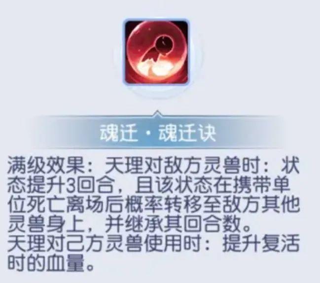 现效果:天理对敌方灵兽时,状态提升3回合,该状态在携带单位死亡后概率转移至敌方其他灵兽,并继承回合数;对己方灵兽使用时,提升复活血量。