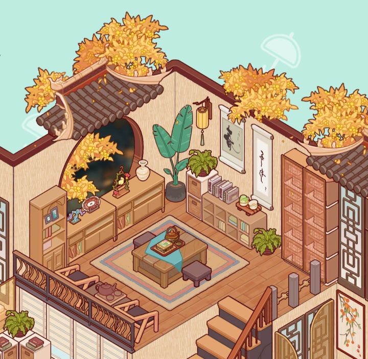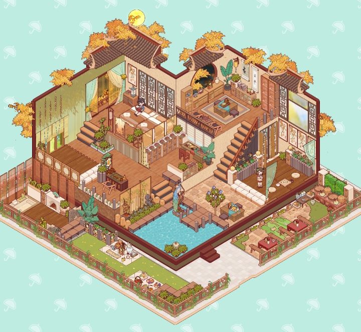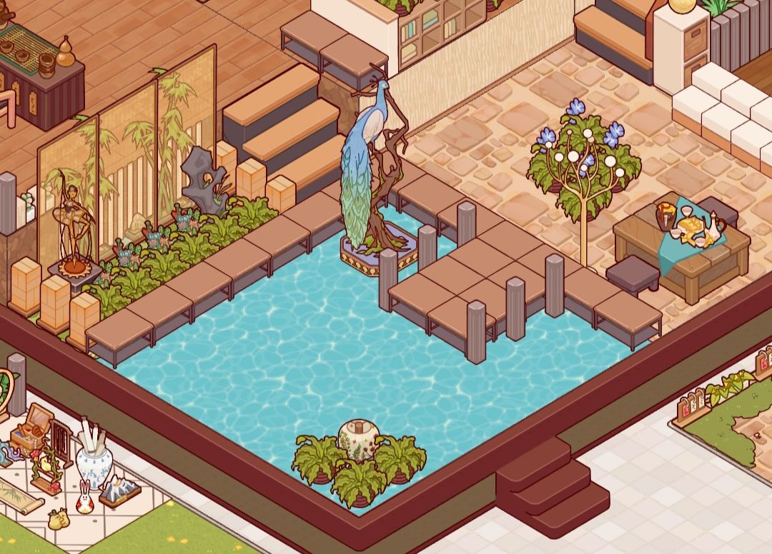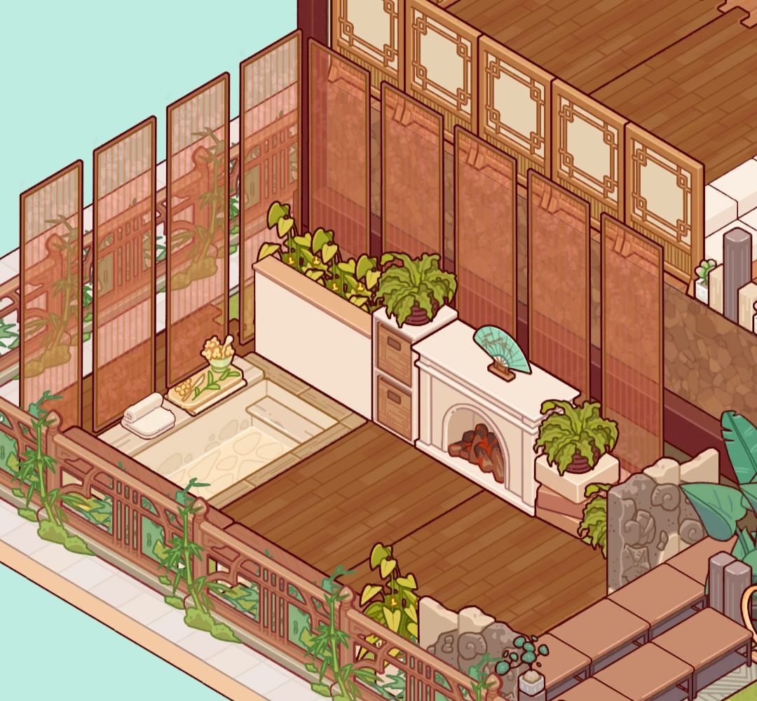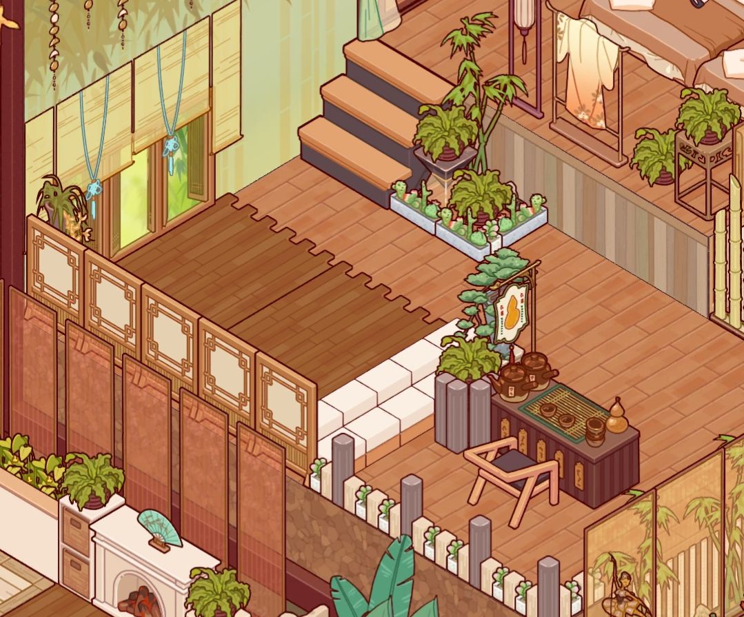 图七是庭院,半围合区域是抚琴的地方,但是我没有古琴,先空着,后续再补,另一半是煮茶区