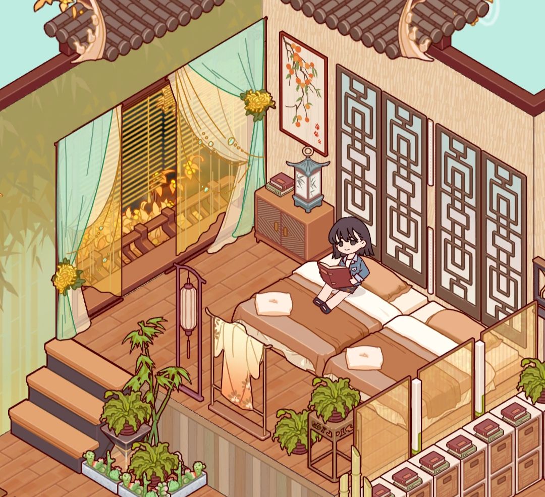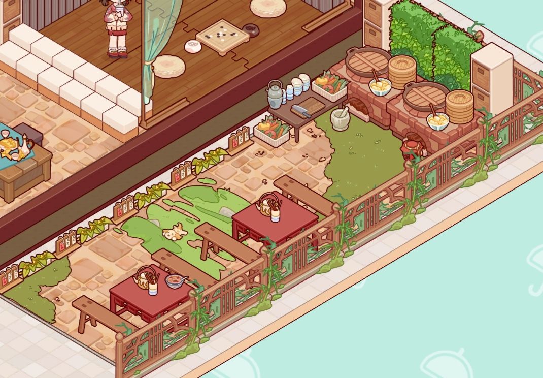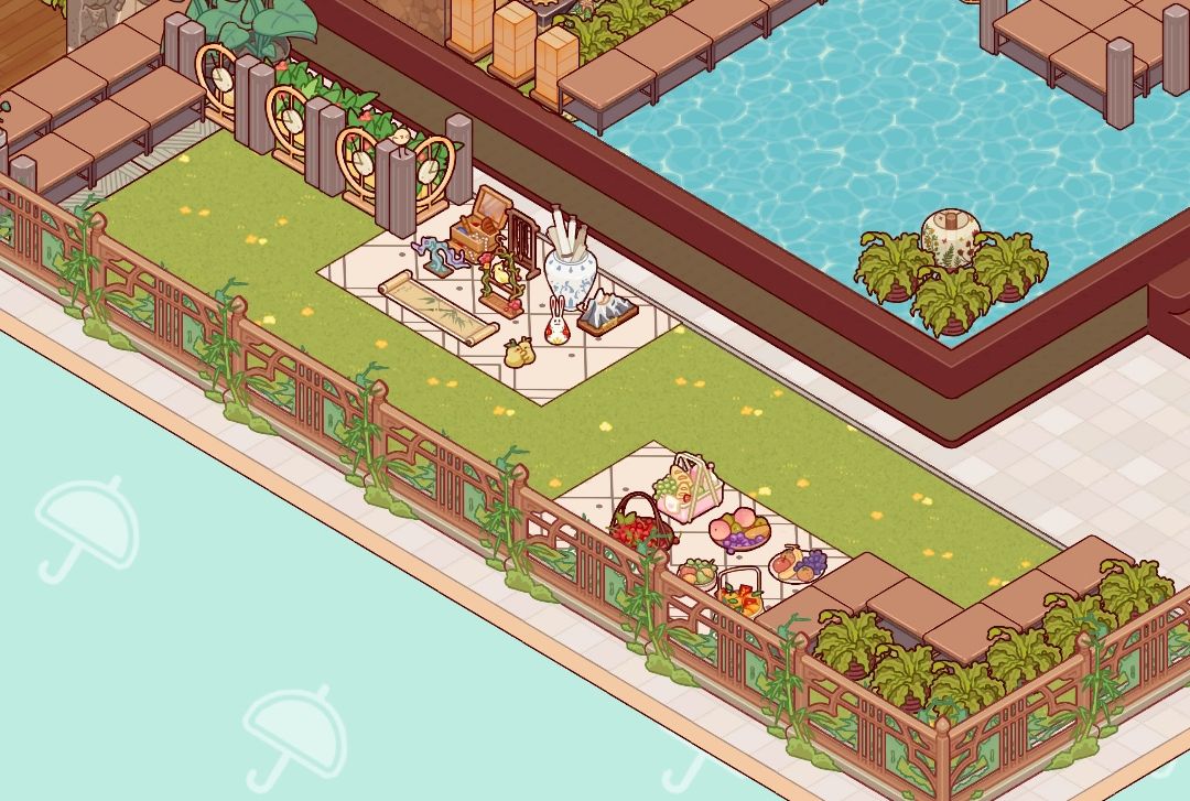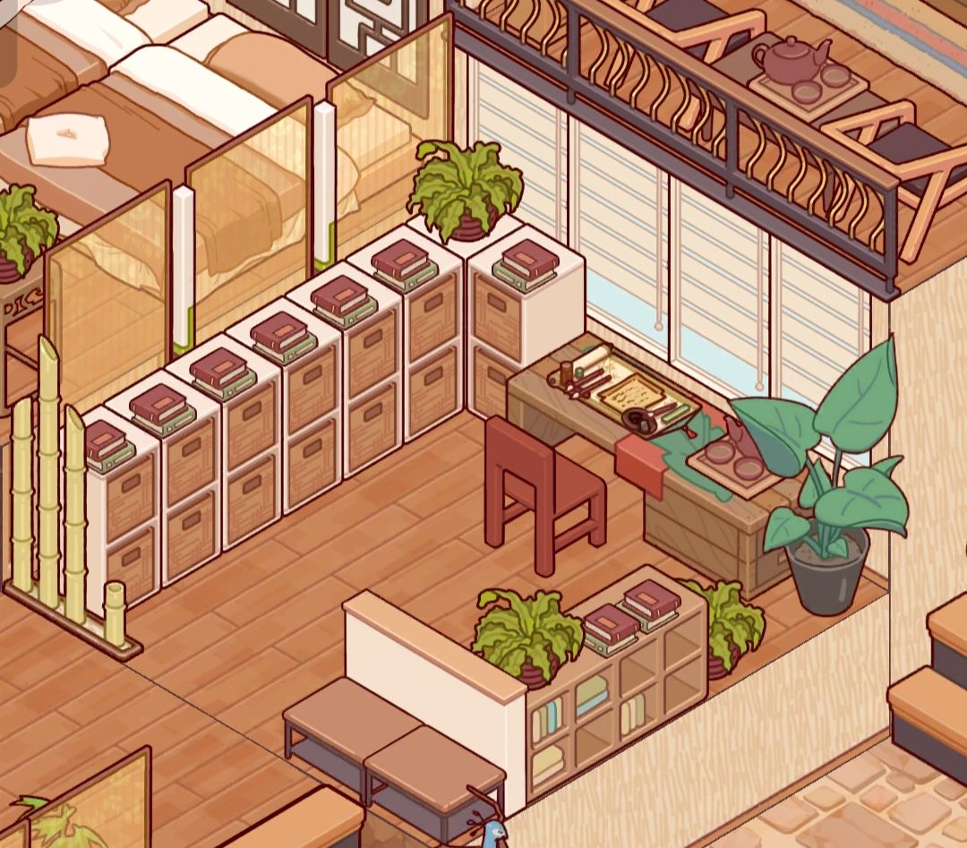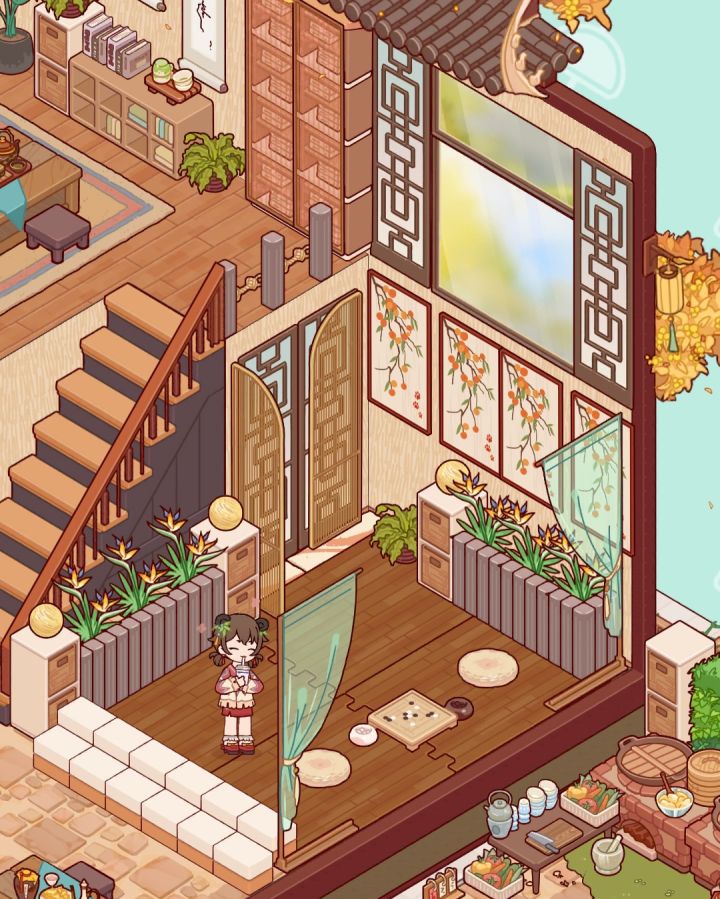 图七是庭院,半围合区域是抚琴的地方,但是我没有古琴,先空着,后续再补,另一半是煮茶区