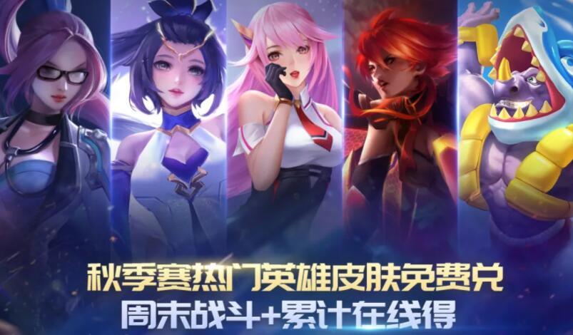 10月14日-10月27日期间,周五-周日战斗+累计在线可获得秋季赛碎片,用于免费兑换秋季赛热门英雄和及热门英雄相关皮肤。