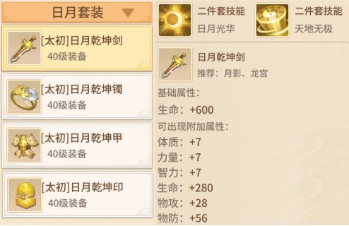 日月套装包括日月乾坤剑、日月乾坤镯、日月乾坤甲、日月乾坤印。