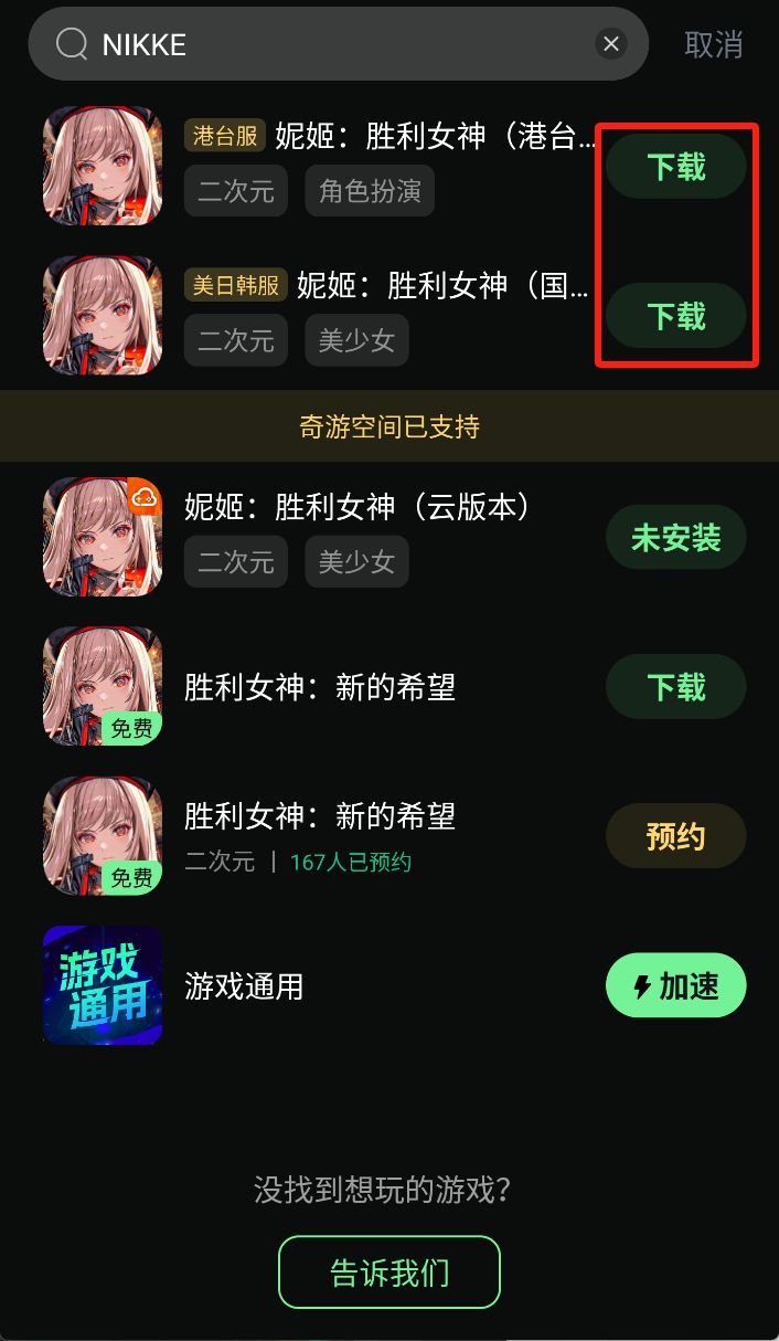 第三步:奇游内搜索【NIKKE】就能下载游戏!(好耶~)港台服与国际服都可以下载!