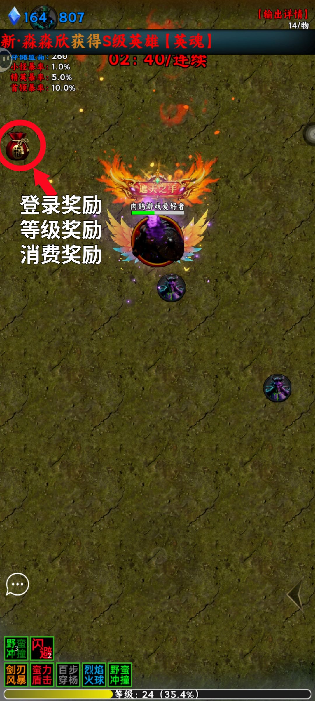 消费达到一定目标后点击游戏左上角的福袋领取消费奖励~