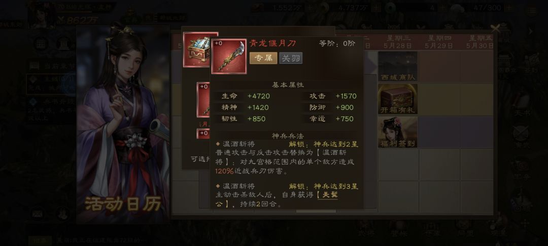 同时所有的自选神兵都优先选关羽神兵,直到3星后再换其他的,因为关羽神兵3星后有一个核心机制那就是杀敌后可以续上美髯公buff,美髯公可以让关羽提升20%攻击,如果没有3星神兵的话,开局2回合后关羽就没有这个buff了,攻击会下降一个档次,氪佬可以直接拉到5星,因为5星只需要暴击就可以无限续buff,打桩能力max。