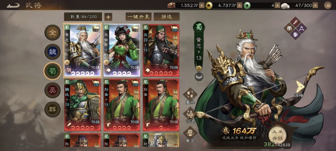 再说回普通卡,前期肯定是优先拉满黄忠,配合升星活动可以白嫖一个黄忠神兵,黄忠拉满之后再开始刷关银屏,进一步强化打桩能力,蜀国续航能力最强的就是关氏父女了,其他人都是开局2-3回合强然后就没有然后了-_-