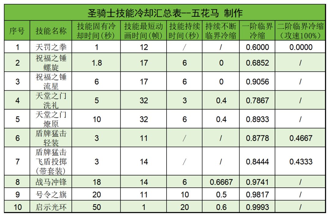这里统计了圣骑士各个技能的施法时间,以及冷却相关数据,供大家打造自己的流派作为参考。