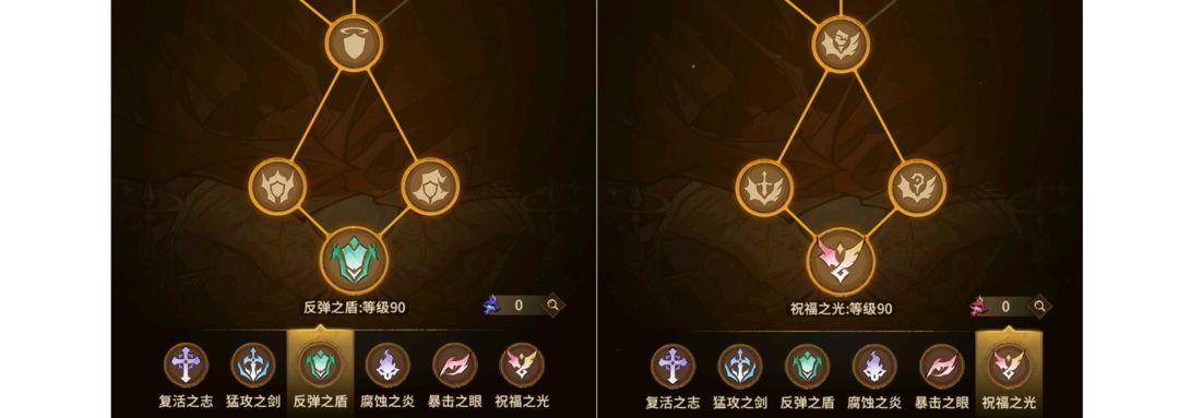 从触发条件可以看出,反弹之盾和祝福之光的触发最容易,反弹只需要挨打即可触发,而每回合挨打的次数则要比出手的次数要多了,祝福之光的触发则是获得任意增益时,也就是说不管是辅助给自身加增益,挨打触发增益,暴击触发自身增益增加,神器给自身施加增益等等这些,都可以触发,所以前期推荐升反弹和祝福的天赋树,能获得收益最大,再去升级暴击,腐蚀,猛攻的天赋树,最后是复活。