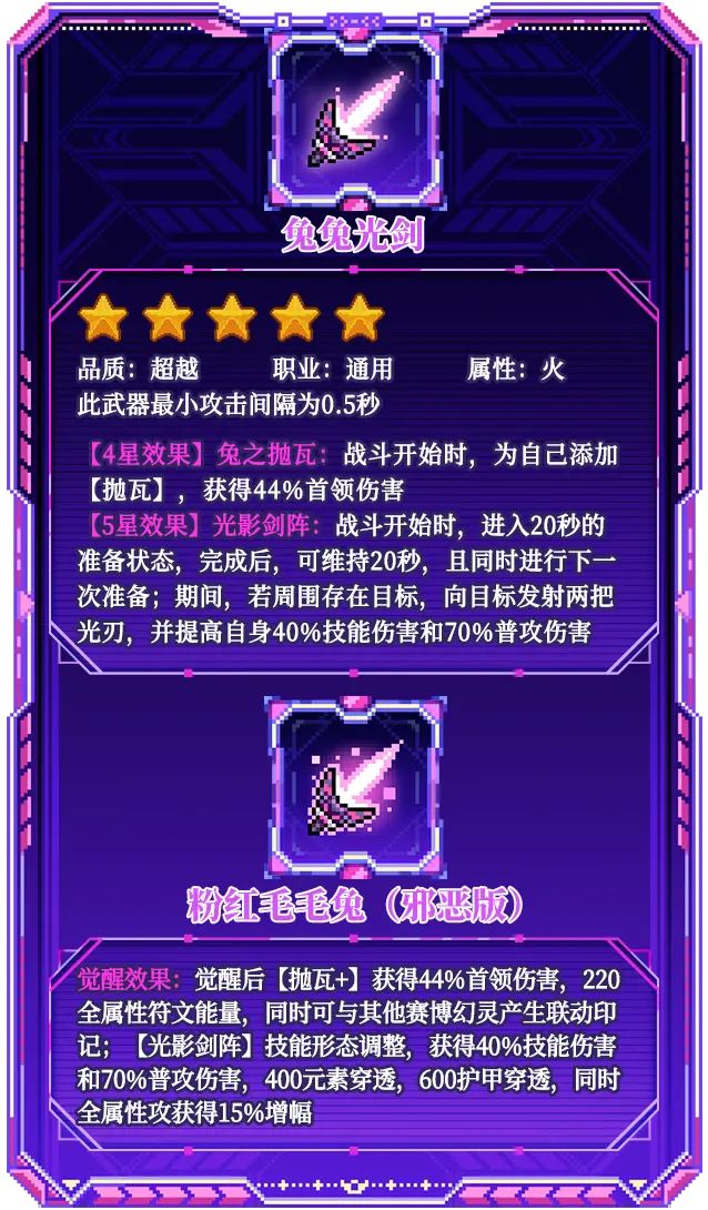 同时这把武器与奇趣限定的不同之处在于奇趣是纯粹的对王限定,双穿等buff是上给单个怪物的,而幻灵限定的双穿是直接加给自己,且上buff还有一定的范围。