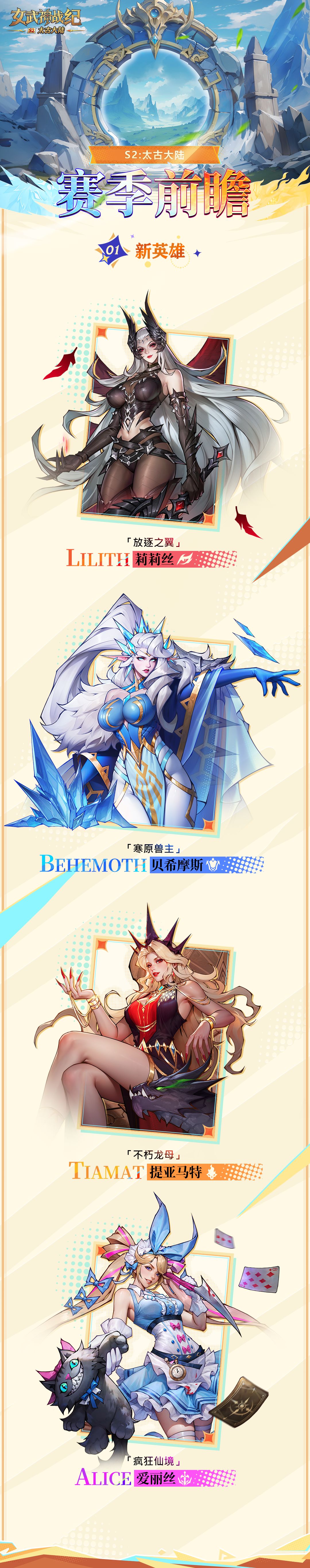 在S2赛季,我们即将踏入的是一片未知的太古大陆,神庭和深渊的势力还未曾显现。古龙族追随龙母[提亚马特],巨兽们追随兽主[贝希摩斯],共同统治着天空,大地与海洋。直到那颗陨石带着[莉莉丝]坠落,一场避无可避的天灾悄然降临到这片大陆之上。