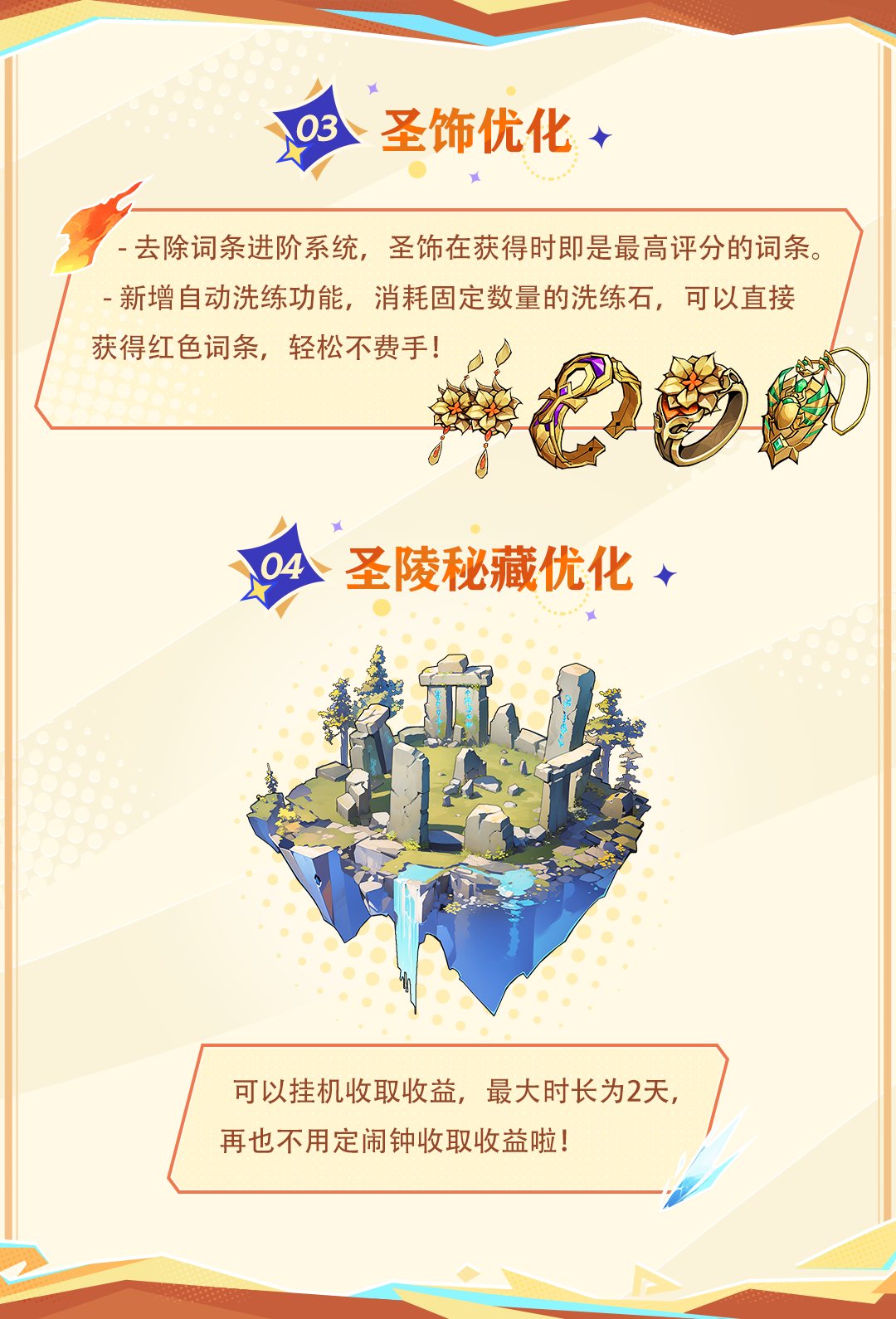 同时,我们也根据守护者的反馈,对「圣灵密藏」玩法进行了优化,移除了搜索所需的圣符/圣甲虫,并且派遣的队员可以不受次数限制地进行持续探索;另外对「上古圣饰」的洗炼、进阶等养成做了简化处理,大幅减少了守护者们在养成上所需要投入的时间。