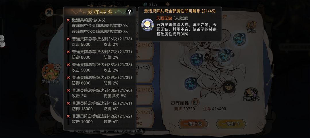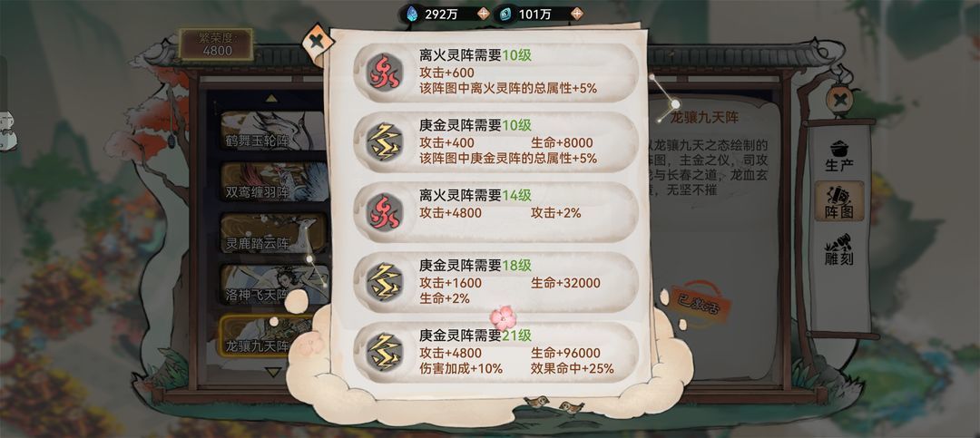 分三个阶段,第一阶段每个弟子拥有2套激活阵图,第二阶段提高灵阵等级质量,并替换高级灵阵,第三阶段目标21级或主c尝试35级,不过不能急,任重而道远哇。35级合适阵图灵阵加4级五行灵阵能加百万以上战力