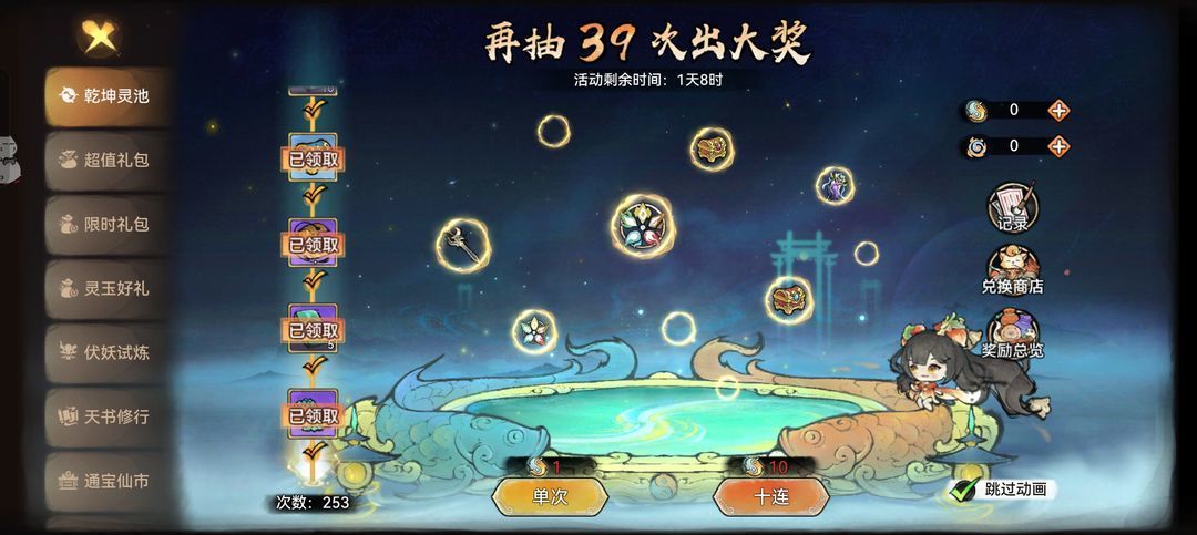 乾坤池活动可以买1000玉及以下档位攒三期500抽再抽,拿全奖励,现在也可以直接积攒一千抽再抽