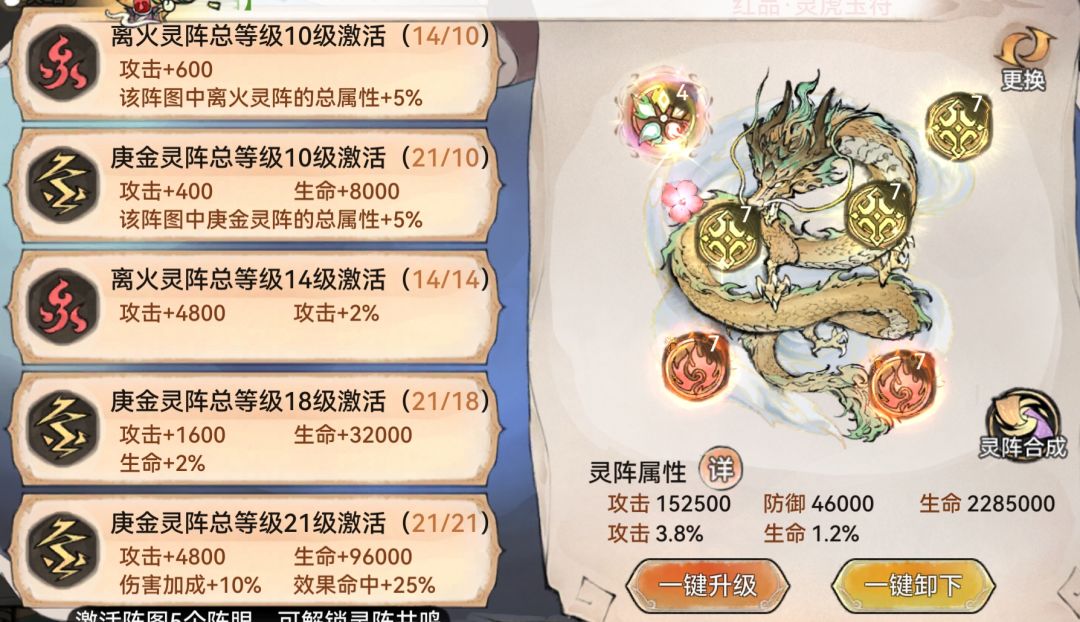 每个位置可以放置一个灵阵,而不同属性的灵阵可以激活对应的效果,以万金油金阵图来说,优先推荐激活的属性是21级金阵,再有额外火阵就再额外激活14级火阵。不同的零阵可以激活不同的属性,之下会做分析。红色玉符属于最高等级的玉符,其灵阵总等级达到35级之后,会有额外属性,此效果只有红色玉符所有,橙色及紫色玉符没有这种额外属性。由此可知,灵阵终点是红色3潜力高等级玉符。