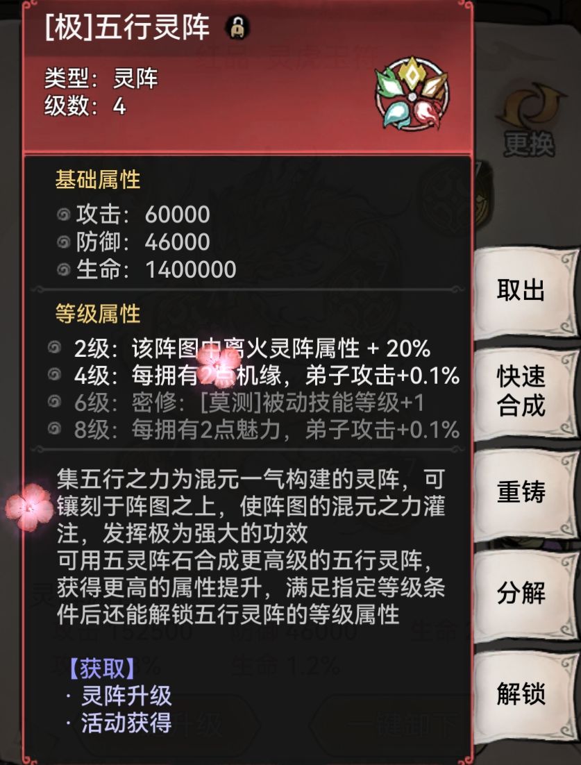 每一个玉符上还存在第六个孔位,默认开启,该孔位镶嵌五行灵阵,五行灵阵分为1到8级,任何玉符都只能镶嵌一个,其拥有较高的基础属性,该灵阵升级之后达到对应等级解锁对应额外等级属性,如图所示,推荐给一个主c弟子制作一个四级五行灵阵,可以高额增加对应属性。