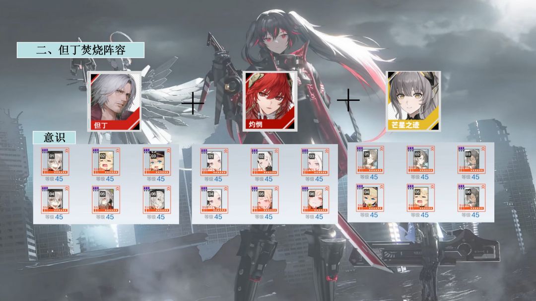 但丁队长,增幅型角色选薇拉·灼惘,装甲型角色选七实·芒星之迹;如果要打爆发,七实换成渡边·尘铭。