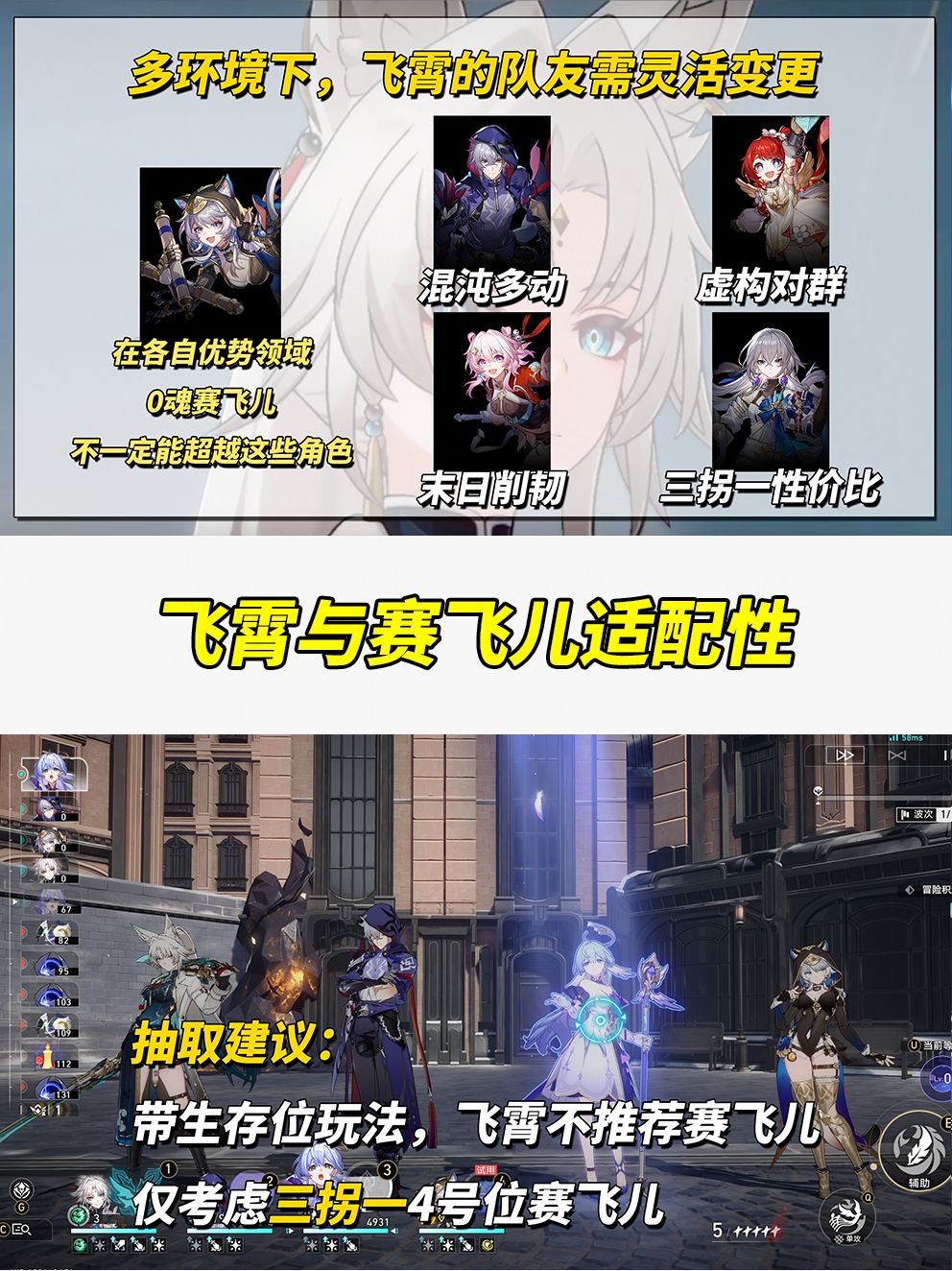 【飞霄】追击队发展至今,配队丰富度高,可更换队友应对各种环境。尝试了几种战斗体验,赛飞儿的追加频次不够高,不利于飞霄叠层,更多依靠赛飞儿自身爆发弥补飞霄终结技的亏损。