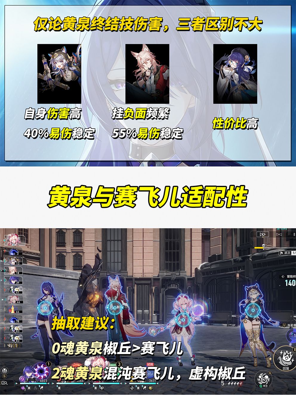 「建议」0魂黄泉,椒丘>赛飞儿,因混沌回忆输出压力大,上场机会少,优先考虑虚构叙事对群优势环境;2魂及以上黄泉,视自身常用环境选择补角色方向,虚构椒丘、混沌赛飞儿。