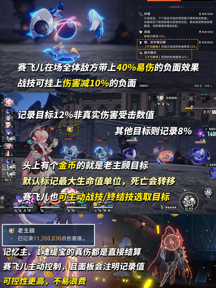【增幅能力】只要赛飞儿在场,所有敌方都会挂上40%易伤负面效果,全局覆盖不会受波次、召唤等等因素影响。此外战技可对目标施加虚弱效果,使敌方造成伤害降低10%。