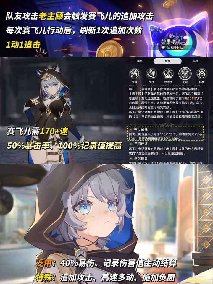 【多动机制】赛飞儿有1次追加攻击机会,在我方攻击老主顾时立即触发,轮到赛飞儿回合开始时刷新可用次数。大致可理解为,1动1追击,此伤害额外提升100%暴击伤害,算是除终结技外的主要输出了。