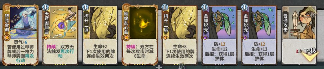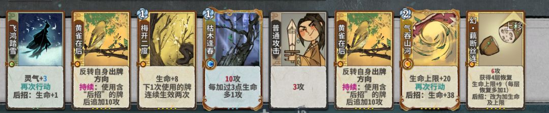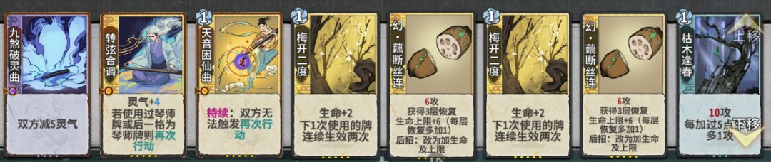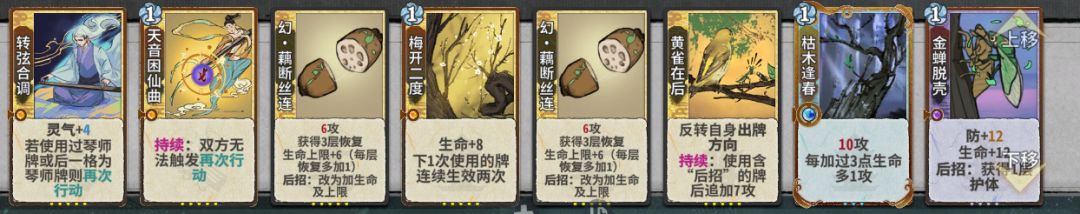 这里说一下我们化神前比较有战斗力的卡:众星+多段、静气 回春+枯木、杯弓流水无情、海底螳螂气疗术、金蝉。这些牌以及4/5轮之前的星弈夹、金鸡、斩草,可以合成3-4张二级牌(幻境效果拿牌也会增加勤学计数)。