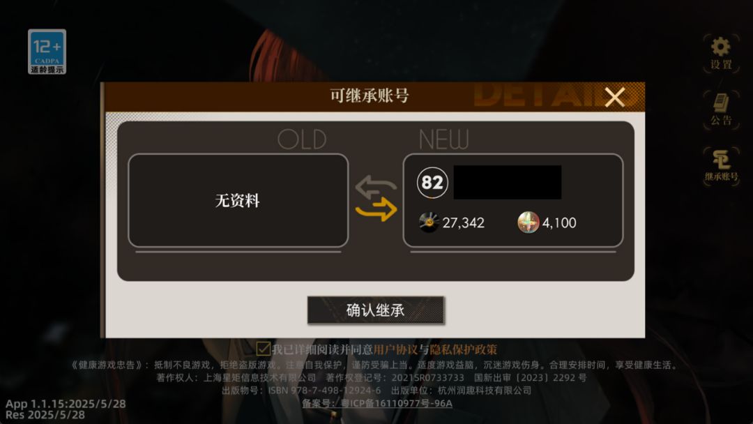 5. 确认无误后,点击【确认继承】即可完成转移。此时您会直接返回登录主界面,并且可以正常进入游戏。