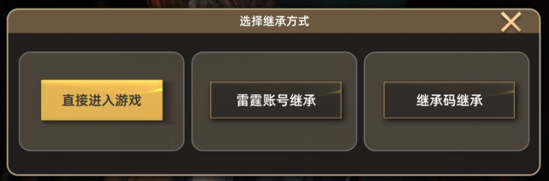 2. 此时会弹出两个选项,【雷霆账号继承】和【继承码继承】。如果您从未进入游戏,则会显示【直接进入游戏】、【雷霆账号继承】和【继承码继承】三个选项。