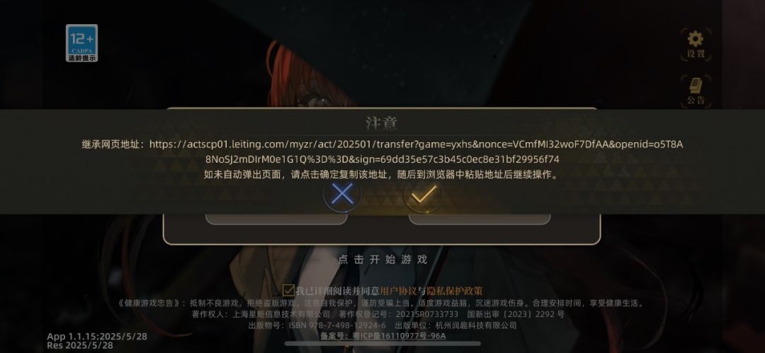请注意:目前iOS18以上系统版本中,您可能遇到无法正常弹出账号转移页面的问题。针对这一问题,游戏客户端会弹出一个提示窗口,您只需点击确认、复制相应链接,然后将其手动粘贴至浏览器的访问地址栏中,即可进入账号转移页面,完成后续的操作。