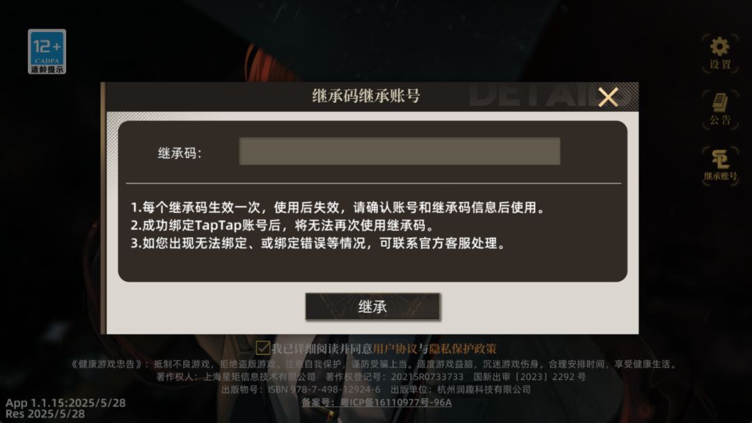 1.如果您需要使用账号继承的相关功能,在登录您的TapTap账号之后,可以点击画面右侧的【继承账号】按钮。