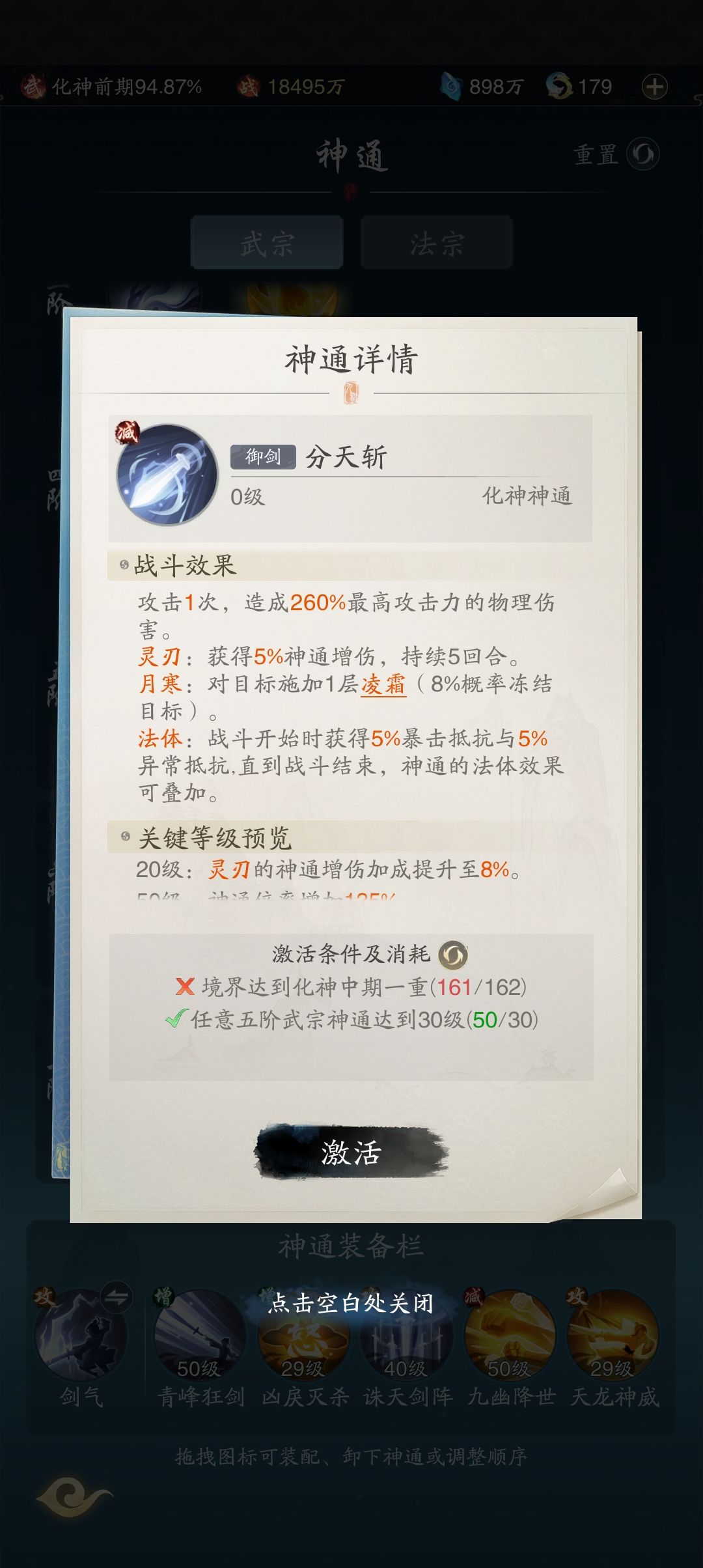 看到剑宗功法被动,巨剑术,是增加神通伤害的,所以技能顺序就是分天,九幽,凌虚,九曜,巨剑。这样子可以全程保持神通增伤,