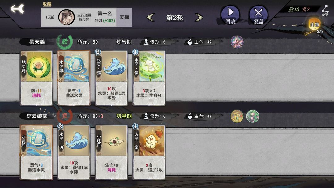 炼气篇:第一轮4修角色龙瑶,三修角色陆剑心老头,必定两修角色忘忧,大概率不到两修角色四水。自己是高修角色打比自己低修的角色注意卡先手,自己低修打对面高修可以不卖牌等二轮看看变化,同修角色不留手牌。自己卡炼气或者对面疑似卡炼气的具体情况具体分析。注意练气牌在2级升到3级时一般增加3点数值,投资回报率远不如将第三张卖了获得先手。第一轮一人四十血,当你一圈够20的时候且有先手就大概率能赢。注意打锻玄可以一圈不到20,或者防守牌质量够高也很优势。尤其是遇到炎尘男五行这种需要滚雪球的英雄,你在出门多赢他一两把可能会提前结束他一把游戏。