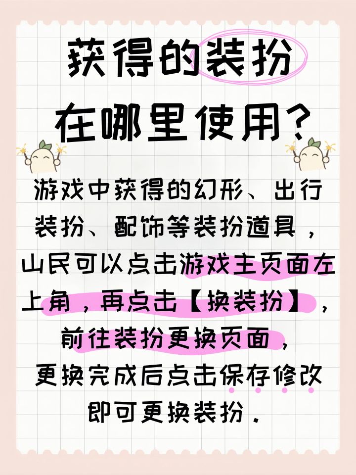 游戏中获得的幻形、出行装扮、配饰等装扮道具,山民可以点击游戏主页面左上角,再点击【换装扮】,前往装扮更换页面,更换完成后点击保存修改即可更换装扮。