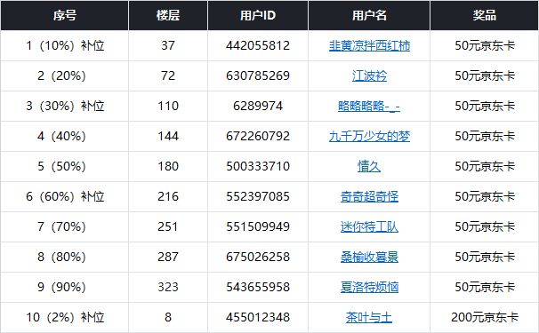 1.凡是踩中总楼层10%、20%、30%、40%、50%、60%、70%、80%、90%(楼层数四舍五入)共9名且符合活动格式的将军,都能获得50元京东卡奖励;