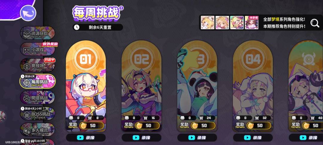 经过改版,每周挑战一个月4次。每次10关,每关50水晶。